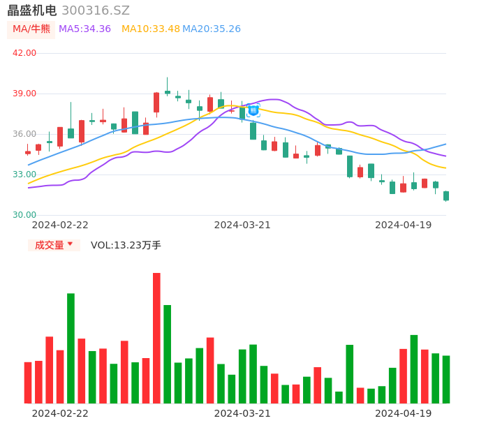 晶盛机电在3月22日出现日线级别熊点,股价已经进入下降通道,且60分钟级别也处于熊点信号,短中期持续走弱,建议继续谨慎观望。