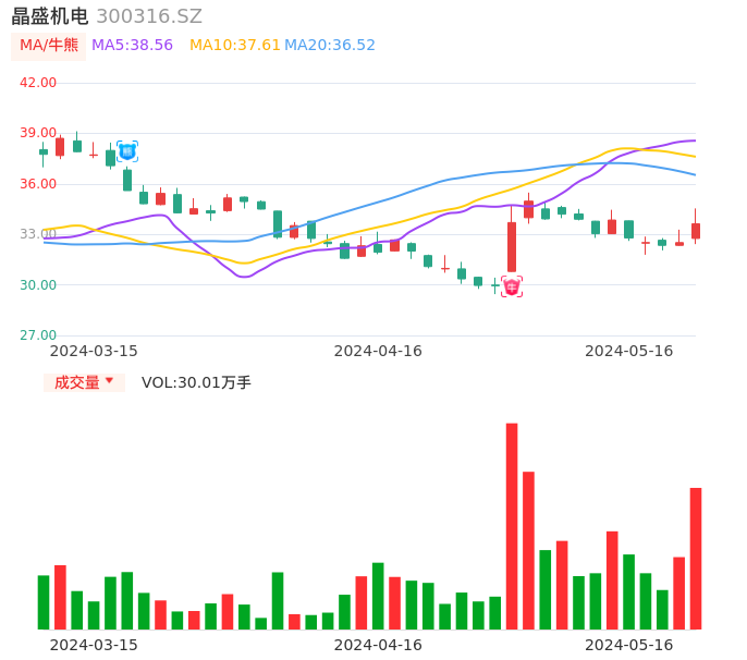 05月16日,晶盛机电收报33.63,股价涨幅3.45%,成交金额10.10亿元,换手率2.44%。