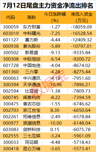 尾盘资金继续出逃AI概念,中科曙光、紫光股份等算力概念股净流出超亿元,新易盛、中际旭创等CPO概念股净流出超9000万元。