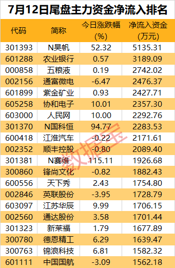 个股方面,尾盘市场资金偏谨慎,净流入超5000万元的仅新股N昊帆。农业银行净流入超3000万元排第二,五粮液净流入2742万元排第三。