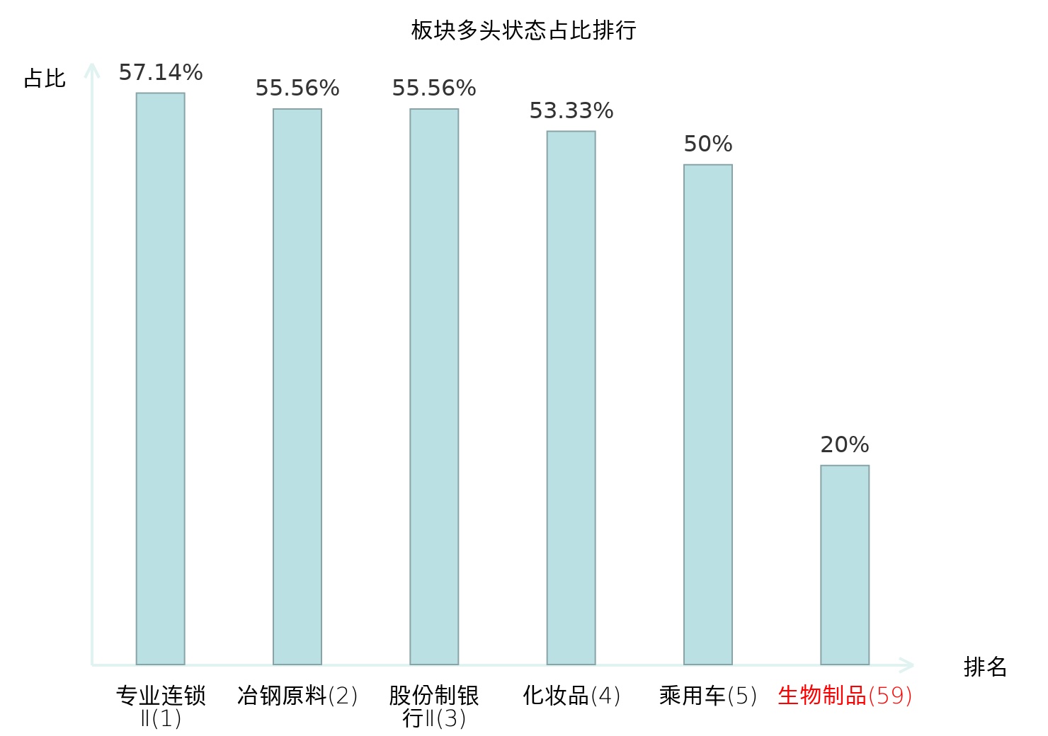 全市场所有行业板块中主力多头状态占比排名中,专业连锁Ⅱ板块位居第一。房地产服务板块名次提升最快,较昨日上升52位。