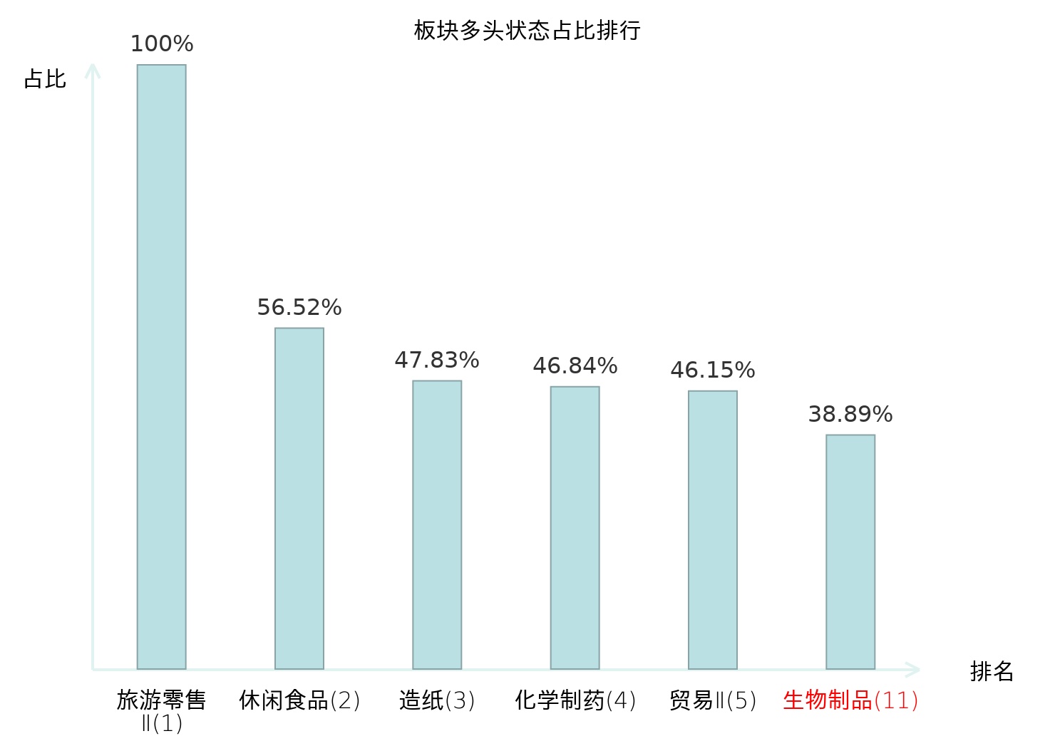 全市场所有行业板块中主力多头状态占比排名中,旅游零售Ⅱ板块位居第一。动物保健Ⅱ板块名次提升最快,较昨日上升58位。