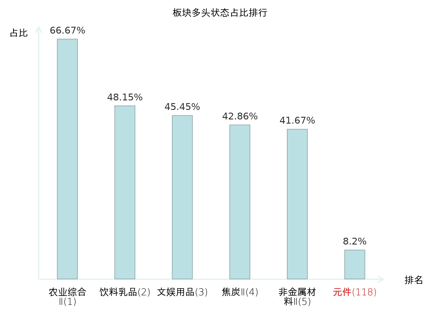 全市场所有行业板块中主力多头状态占比排名中,农业综合Ⅱ板块位居第一。特钢Ⅱ板块名次提升最快,较昨日上升46位。