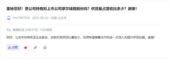 上证报中国证券网讯 有投资者提问麦捷科技,公司持有拟上市公司摩尔线程股份吗?供货量占营收比多少?对此,麦捷科技24日在互动平台回复称,公司未持有所述企业股份,目前向其供货比重较小,后续有望随着合作的进一步深入而提升供货份额。