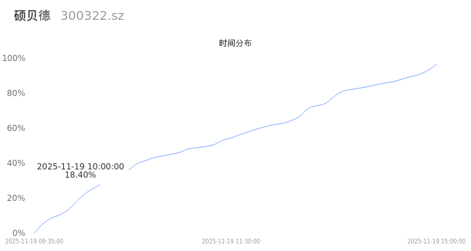 300322硕贝德2025年11月19日成交12.71万手,成交金额2.77亿,相较昨日缩量3.36万手,换手率2.89%,成交清淡。