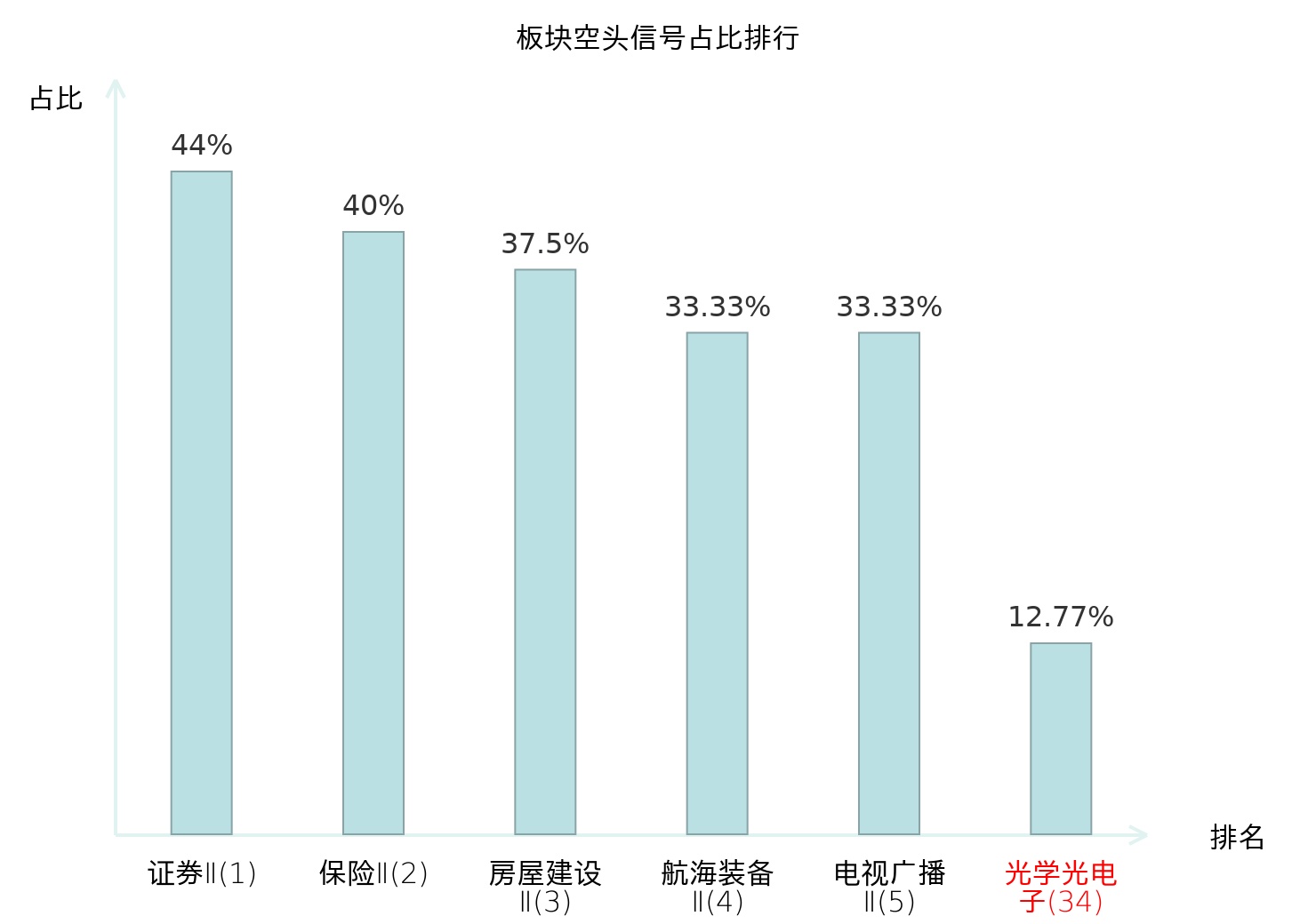 全市场所有行业板块中主力空头信号占比排名中,证券Ⅱ板块位居第一。证券Ⅱ板块名次提升最快,较昨日上升125位。