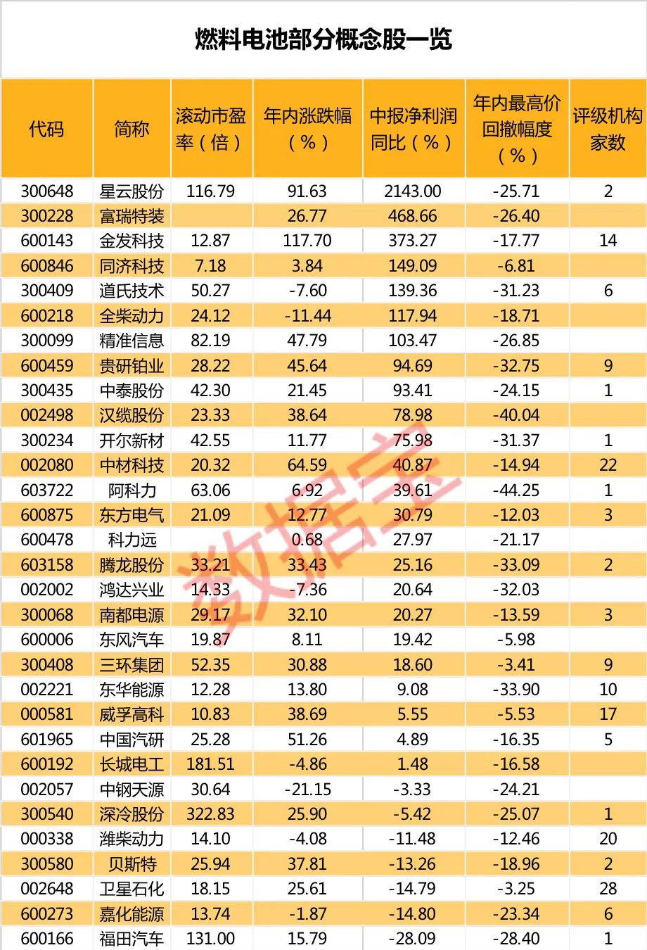 证券时报•数据宝粗略统计显示,燃料电池相关个股共有60只,年内回调幅度较大,回调幅度超30%的个股有21只,仅有19只个股在9月上涨,且月内涨跌幅超5%的概念股有7只。阿科力、美锦能源、德威新材、亿华通-U、汉缆股份年内回调幅度均超40%,据中报显示,汉缆股份的净利润同比为78.98%,阿科力则是39.6%。