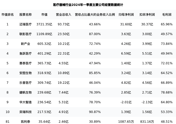 凯利泰最新报告期数据为一季度,下表汇总了医疗器械行业内市值靠前的公司一季度主要经营数据