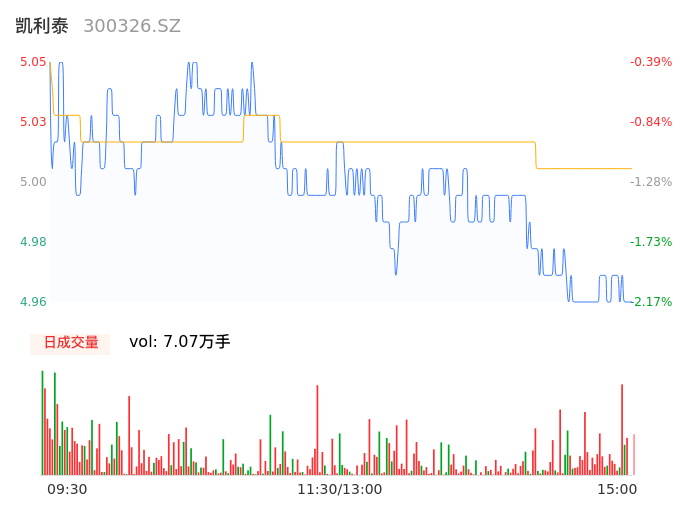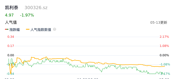 05月13日,凯利泰收报4.97,股价涨幅-1.97%,成交金额3541.61万元,换手率0.99%。