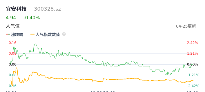 04月25日,宜安科技收报4.94,股价涨幅-0.40%,成交金额6603.86万元,换手率1.93%。