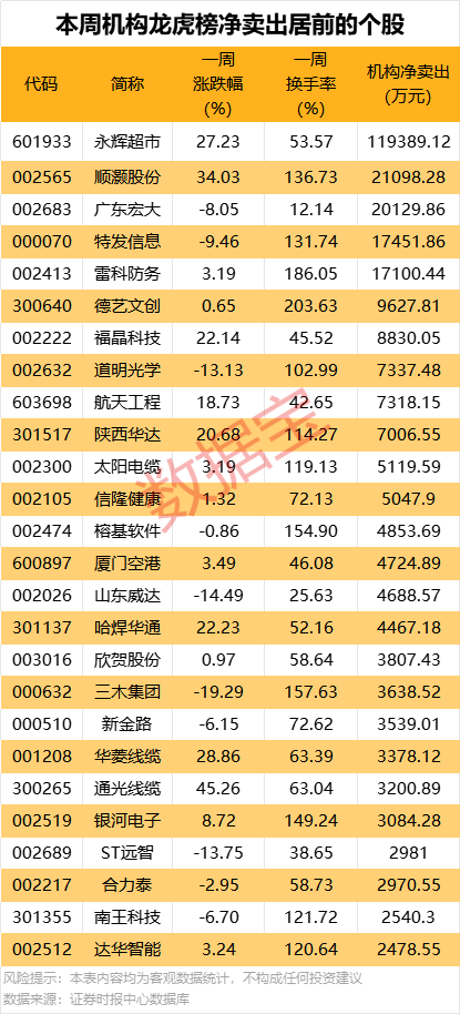 机构净卖出的个股中,净卖出金额最多的是永辉超市,该股本周累计上涨27.23%,周换手率为53.57%,本周3次登上榜龙虎榜,买卖居前席位中,机构合计净卖出11.94亿元,同时上榜的还有沪股通专用席位,净买入650.24万元,营业部席位合计净买入8.71亿元。