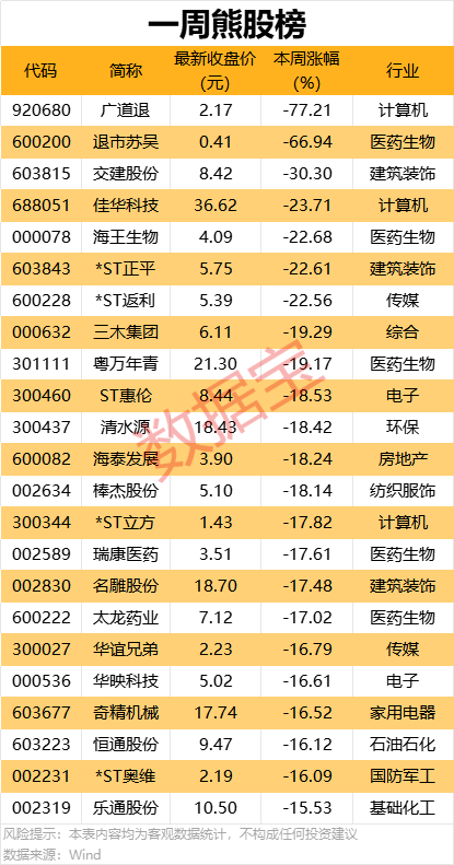 本周累计下跌的个股中,7股跌幅在20%及以上。广道退累计跌超77%,居首;退市苏吴、交建股份、佳华科技等个股累计跌幅也居前。