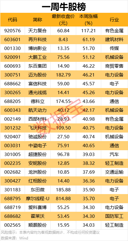个股方面,本周超1700股上涨,28股涨幅超30%。其中,涨幅最大的是天力复合,本周累计上涨117.21%;再升科技、博纳影业、大鹏工业本周累计涨幅均超50%。