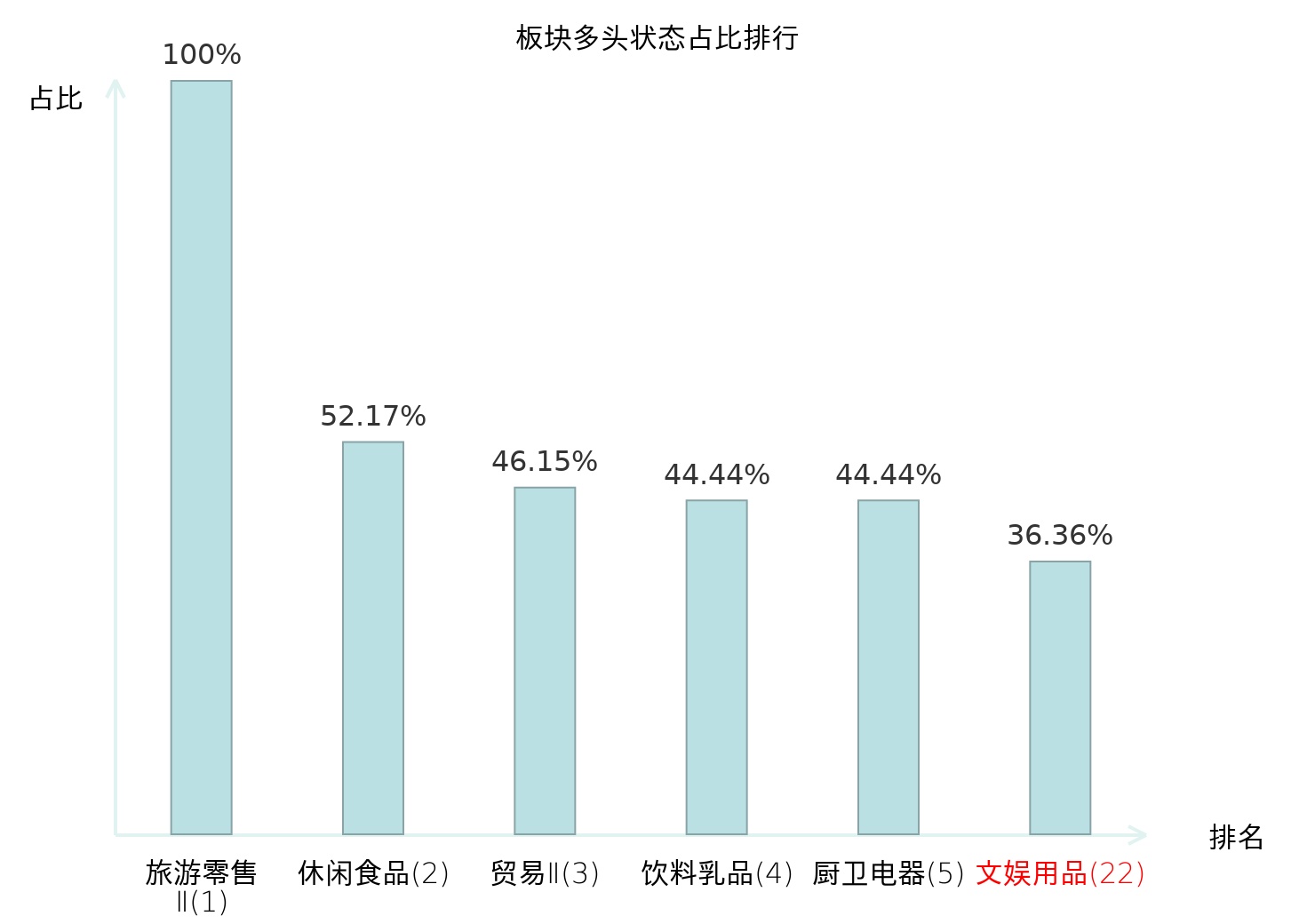 全市场所有行业板块中主力多头状态占比排名中,旅游零售Ⅱ板块位居第一。乘用车板块名次提升最快,较昨日上升91位。