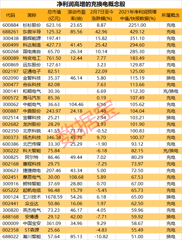 数据宝统计,充换电概念股中,18股2021年度净利润翻倍。杉杉股份净利润增幅高达22.51倍。其后东微半导、鹏辉能源、科达制造、国电南自增幅落在280%-450%区间。众业达、起帆电缆、特变电工估值水平较低,均在20倍以下。