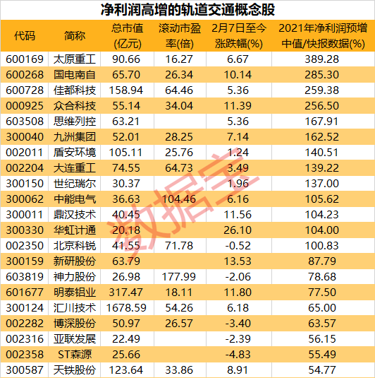 证券时报·数据宝统计,净利润同比增幅逾50%的轨道交通概念股中,13股业绩翻倍,太原重工、国电南自、佳都科技、众合科技净利润增幅在250%以上。年后行情来看,21股平均上涨5.89%,优于同期大盘。6股涨逾10%,华虹计通涨幅最高,为26.1%。估值方面,明泰铝业、太原重工两股最新滚动市盈率较低,均不足20倍。