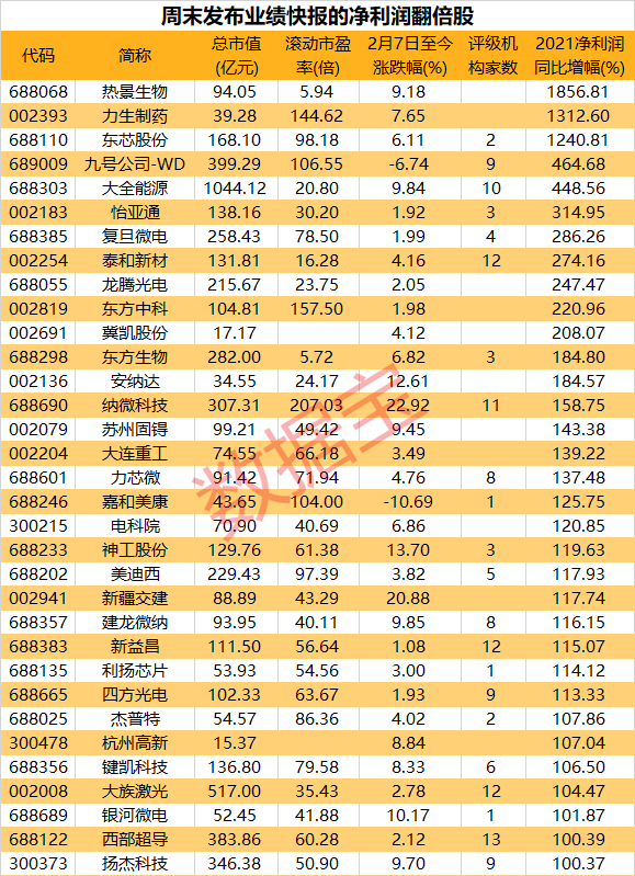 A股年度业绩快报进入密集披露期。数据宝统计,上周末期间多达325股先后发布业绩快报,其中33股净利润翻倍。热景生物、力生制药、东芯股份稳坐增长三甲席位,净利润同比增幅均逾12倍。其后九号公司-WD、大全能源、怡亚通净利润增幅落在300%-500%区间。
