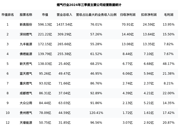 天壕能源最新报告期数据为三季度,下表汇总了燃气行业内市值靠前的公司三季度主要经营数据