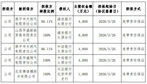 上证报中国证券网讯 天壕能源3月27日盘后发布公告披露为子公司提供担保的进展。公告显示,3月26日,公司分别为控股子公司原平市天然气有限责任公司、全资子公司山西华盛新能贸易有限责任公司、全资子公司兴县华盛燃气有限责任公司、全资子公司北京赛诺膜技术有限公司向相关银行申请的融资额度提供连带责任保证担保。具体请见下表: