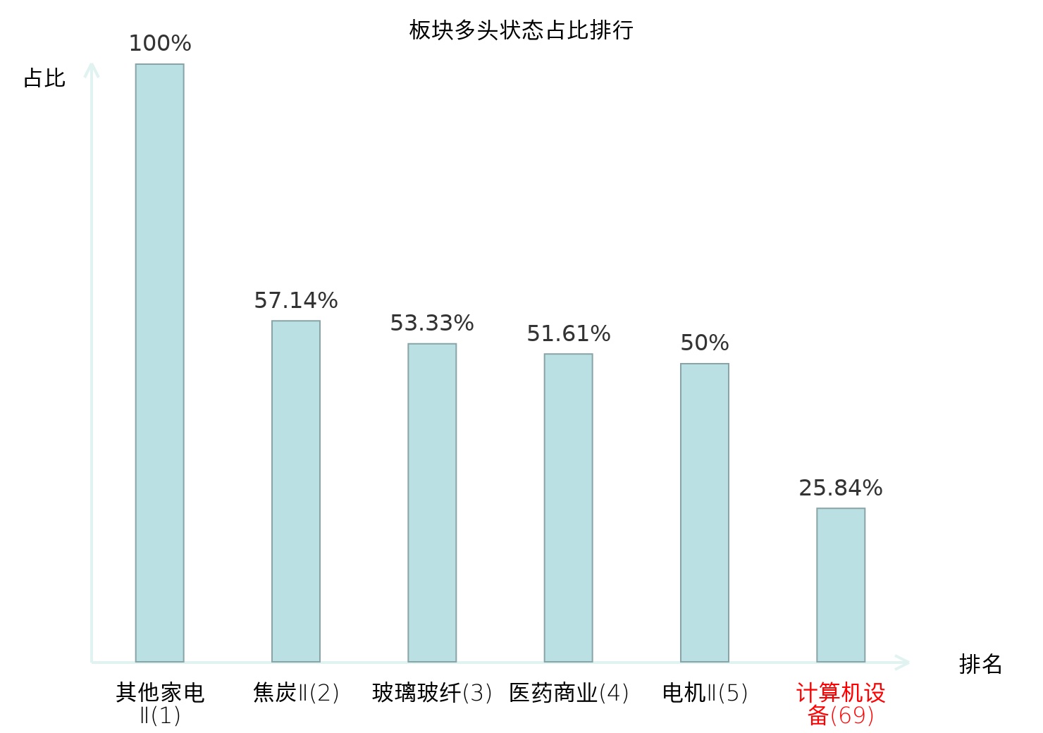 全市场所有行业板块中主力多头状态占比排名中,其他家电Ⅱ板块位居第一。白色家电板块名次提升最快,较昨日上升67位。