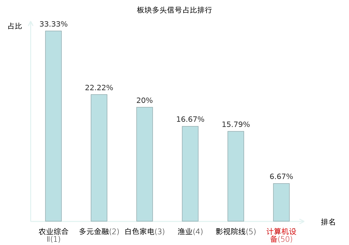 全市场所有行业板块中主力多头信号占比排名中,农业综合Ⅱ板块位居第一。农业综合Ⅱ板块名次提升最快,较昨日上升127位。