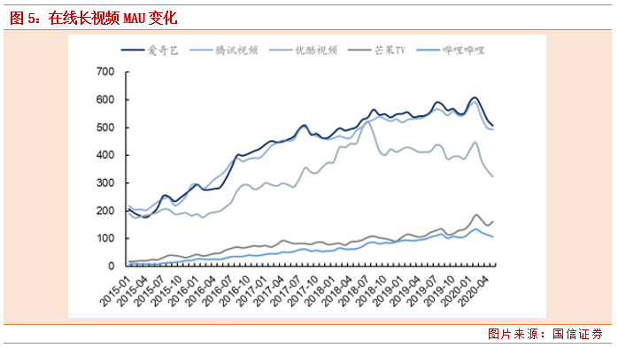 独播策略帮助芒果TV用户活跃数显示逆势抬头迹象,显示出芒果TV爆款综艺的内容优质程度。2020年5月爱奇艺、腾讯视频、优酷视频、芒果TV和B站几大内容平台中,芒果TV的用户活跃环比增速是唯一实现正增长的平台,随着《乘风破浪的姐姐》上线和强势的播放数据,预计芒果TV的活跃用户数有望在二季度实现较快增长。