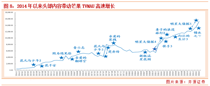从“超女”到“姐姐”,芒果不断重新定义选秀,工业级制作水准保证了节目质量,2014年以来头部内容带动芒果TVMAU高速增长。根据易观千帆数据,2019年12月,芒果TV的MAU(去重后活跃用户数量)为1.27亿,同比增长59%,远超“爱优腾”。