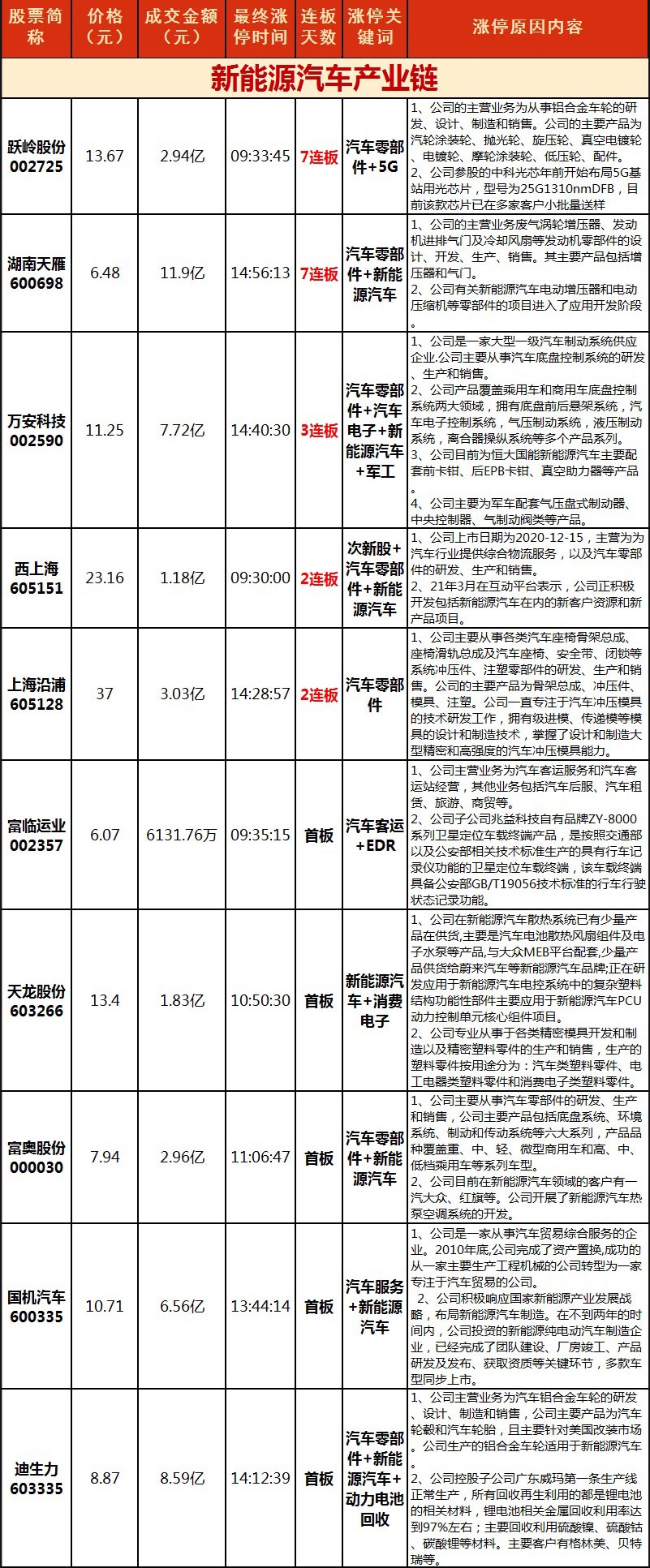今日新能源车产业链相关的汽车零部件概念回暖,湖南天雁、富奥股份、迪生力、万安科技、跃岭股份、上海沿浦、西上海等涨停!!