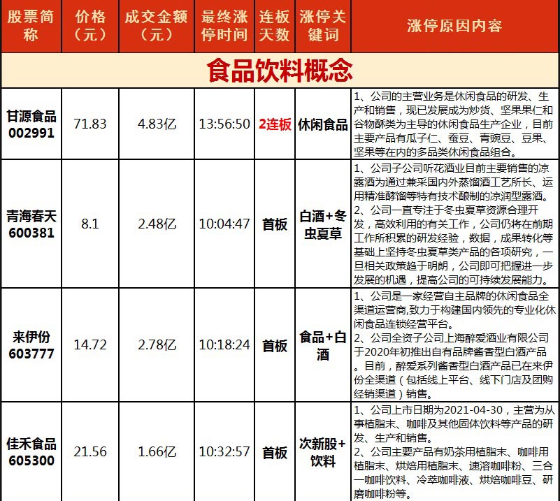 今日食品饮料概念相关的品种维持强势,甘源食品、青海春天、来伊份、佳和食品等个股强势涨停!