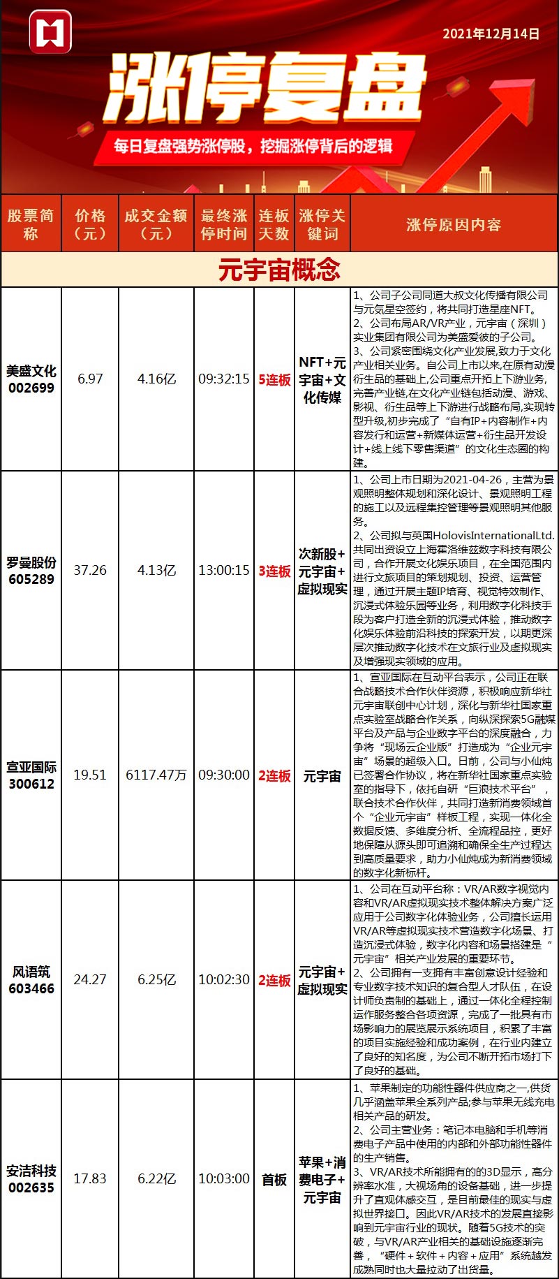 所以,今日元宇宙概念依旧活跃,美盛文化五连板,风语筑、宣亚国际、湖北广电、安洁科技、罗曼股份涨停!!