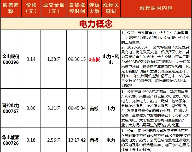 今日相关概念颇受关注,个股金山股份、晋控电力、华电能源强势封板涨停!!