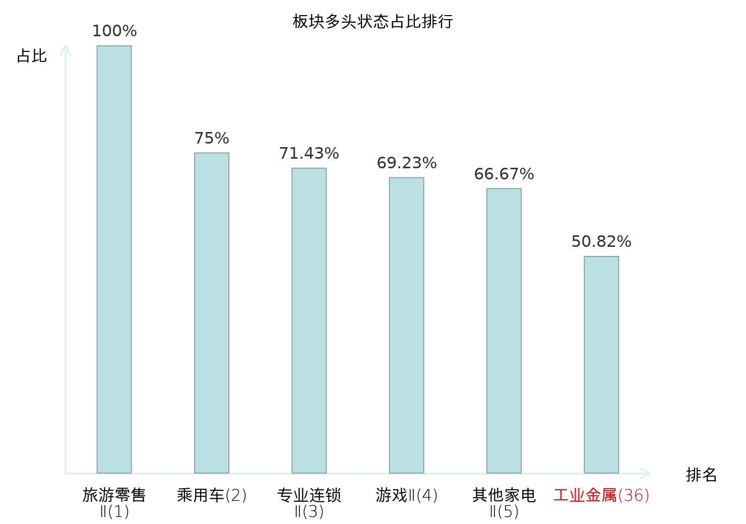全市场所有行业板块中主力多头状态占比排名中,旅游零售Ⅱ板块位居第一。保险Ⅱ板块名次提升最快,较昨日上升82位。