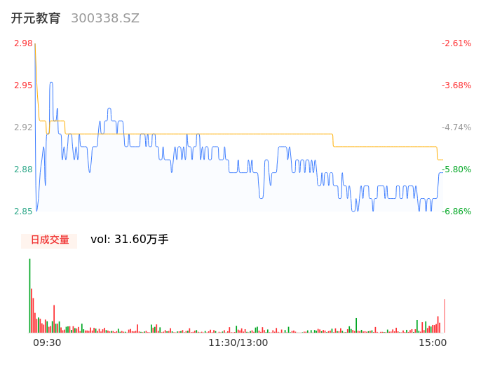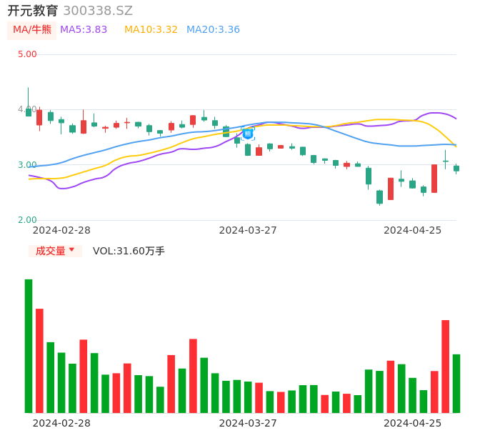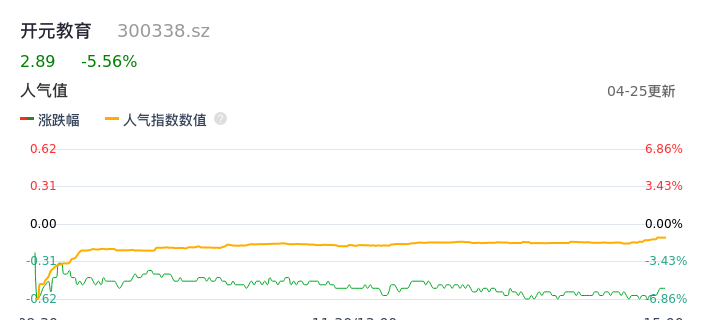 04月25日,开元教育收报2.89,股价涨幅-5.56%,成交金额9145.36万元,换手率9.75%。