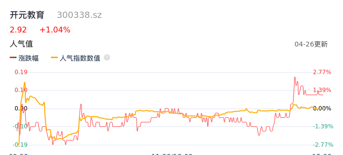 04月26日,开元教育收报2.92,股价涨幅1.04%,成交金额8560.06万元,换手率9.19%。