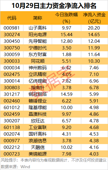 阳光电源主力资金净流入14.65亿元,居次席。今日午后,能源金属、电池及固态电池板块联袂走高,阳光电源涨超15%。