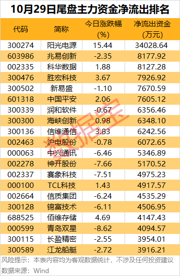 尾盘主力资金净流出方面,阳光电源尾盘主力资金净流出超3亿元,远超其他个股;兆易创新、科华数据、胜宏科技、新易盛、中国平安、润和软件等尾盘主力资金净流出均超6000万元。