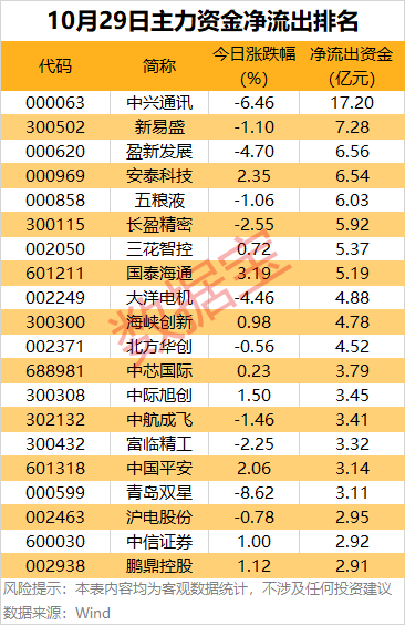 今日有101主力资金净流出均超1亿元,其中,中兴通讯、新易盛、盈新发展、安泰科技、五粮液、长盈精密等热门股净流出金额均超5亿元。
