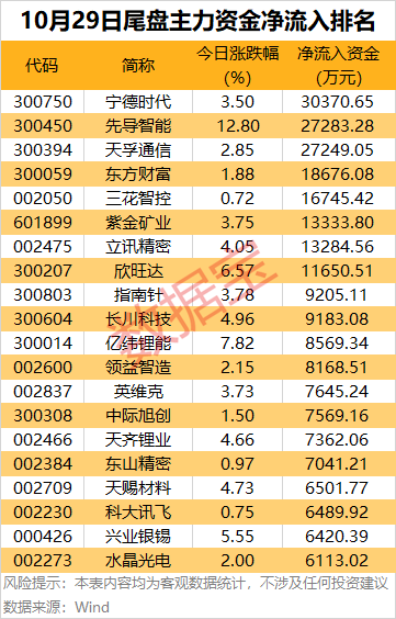 个股方面,宁德时代、先导智能、天孚通信尾盘主力资金净流入均超2亿元;东方财富、三花智控、紫金矿业、立讯精密、欣旺达尾盘主力资金净流入均超1亿元。