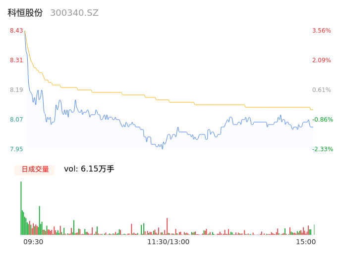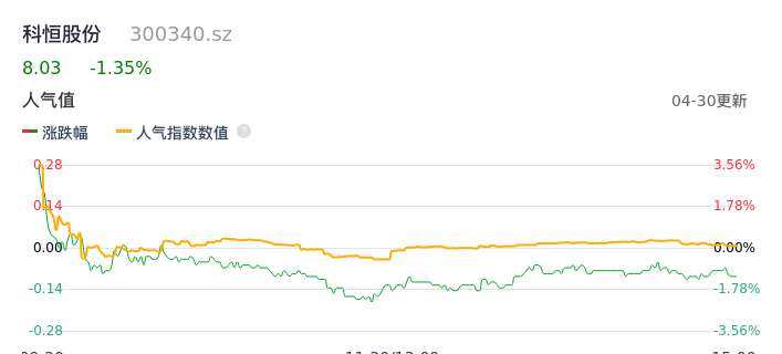 04月30日,科恒股份收报8.03,股价涨幅-1.35%,成交金额4993.14万元,换手率3.29%。