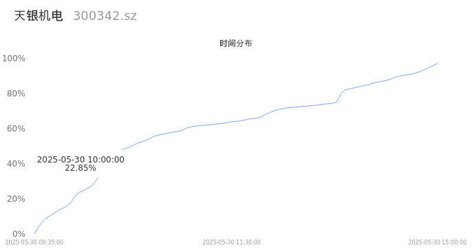 300342天银机电2025年05月30日成交17.42万手,成交金额2.78亿,相较昨日放量2.99万手,换手率4.17%,成交清淡。