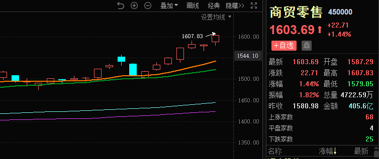 零售方向下午也有一波拉升,但是力度没有想象中的强,很多个股有大单买,有点火,但是没有明显后续的大资金接力。市场对科技切消费的这种高低切还处于半信半疑的状态,比较犹豫,尾盘科技V了回来,消费零售这边冲高回落的多,但是如果一旦国产算力为代表的科技股调整震荡一下,那么资金还是会往消费回流的,毕竟马上就要双节临近,是有一定的消费零售表现的预期的。