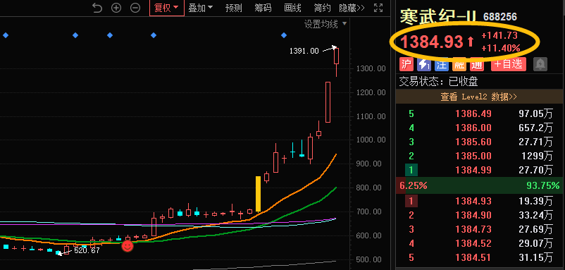 典型的趋势抱团股就是近期股价连续大涨直逼贵州茅台的寒武纪,截止收盘寒武纪1384.93,贵州茅台收盘价:1490.33,两者就差100块钱左右,曾经的A股机构抱团白酒消费,公募基金最喜欢配置白酒,这才有了贵州茅台最高2400元的股价,而如今寒武纪股价一旦超过贵州茅台,那将是划时代的意义,将宣布新的一轮科技强国的盛世。