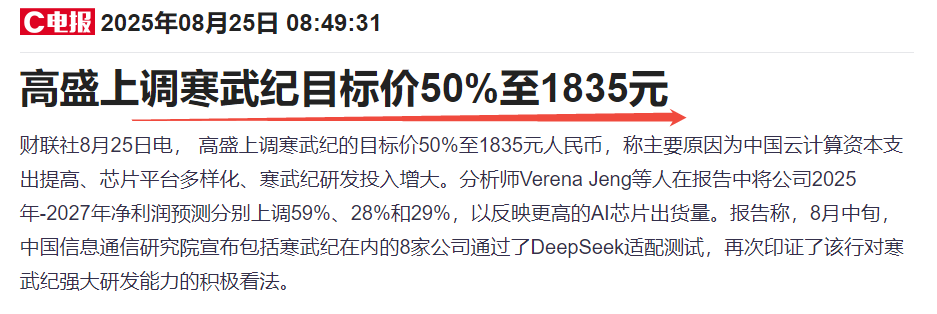 而随着DeepSeekV3.1的发布,今天盘前的时候高盛也是再次上调寒武纪目标价至1800元上方。这一次大家会选择相信吗?
