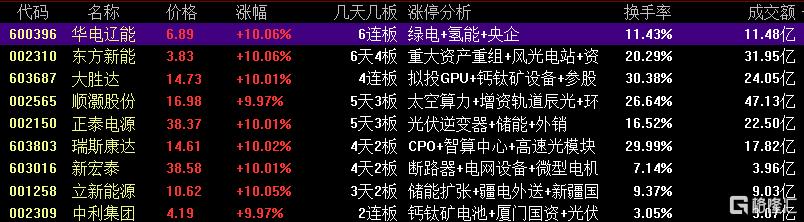 焦点股方面,电力股华电辽能6连板、东方新能6天4板,储能板块正泰电源9天5板,并购重组的大胜达4连板。