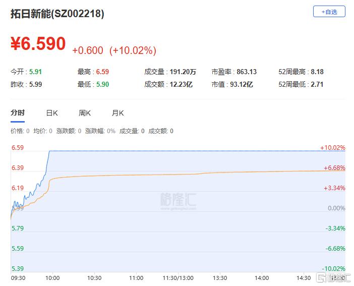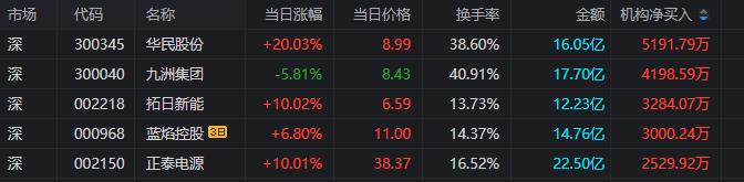 拓日新能:今日涨停,全天换手率13.73%,成交额12.23亿元,振幅11.69%。龙虎榜数据显示,机构净买入3284.07万元,深股通净买入4910.71万元,营业部席位合计净买入2.50亿元。
