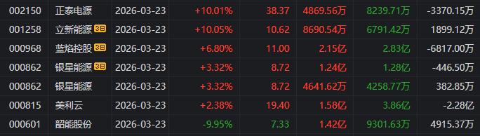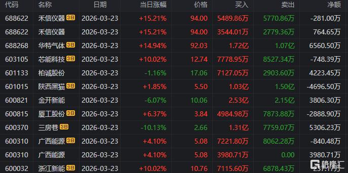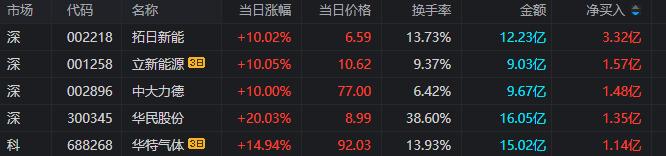 龙虎榜单日净买入额前三为拓日新能、中大力德、华民股份,分别为3.32亿元、1.48亿元、1.35亿元。