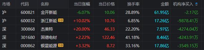 龙虎榜中涉及机构专用席位的个股中,单日净卖出额前三为金开新能、杰美特、固德电材,分别为2.17亿元、4274.04万元、4243.91万元。