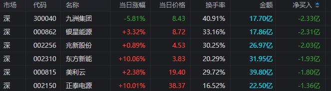 龙虎榜单日净卖出额前三为九洲集团、银星能源、兆新股份,分别为2.33亿元、2.31亿元、2.03亿元。