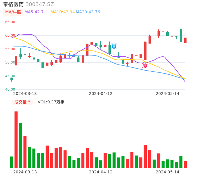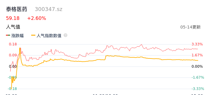 05月14日,泰格医药收报59.18,股价涨幅2.60%,成交金额5.51亿元,换手率1.64%。