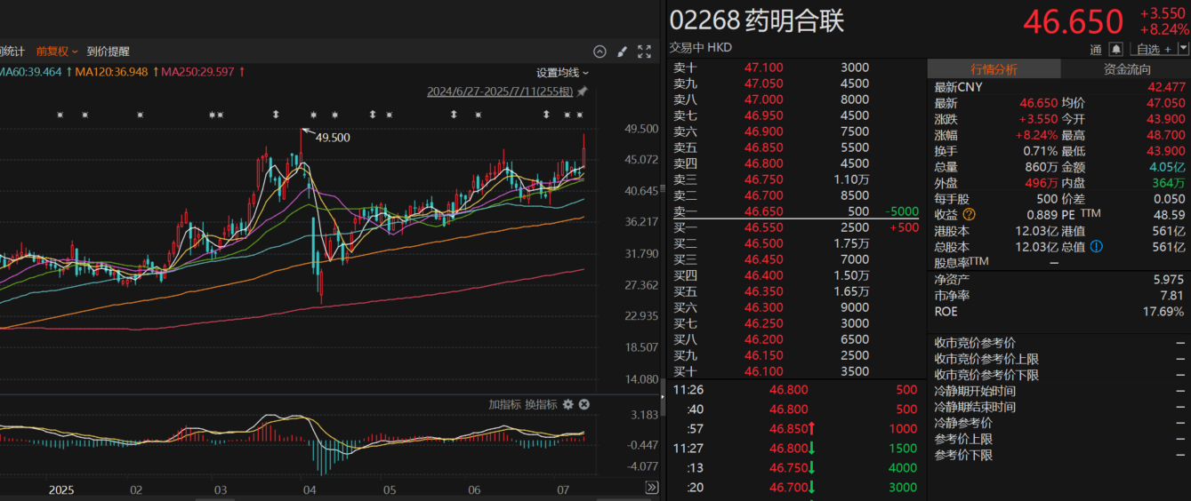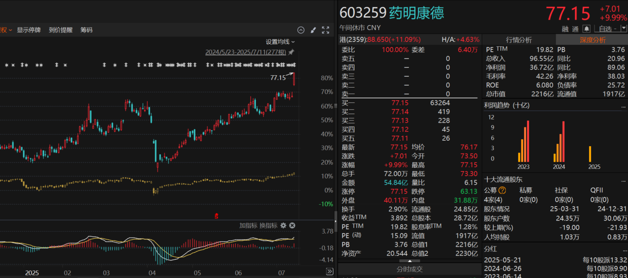 按单季度看,药明康德预计2025年第二季度实现归母净利润48.89亿元,创历史新高。谈及业绩预增原因,药明康德指出,于本期出售持有的药明合联(2268.HK)部分股票预计收益32.1亿元。据悉,该公司系从事生物偶联药物的外包公司,由药明生物以及药明康德子公司合全药业联合成立,其于今年已累计涨超50%,而药明康德今年在A股市场则累计涨超40%。